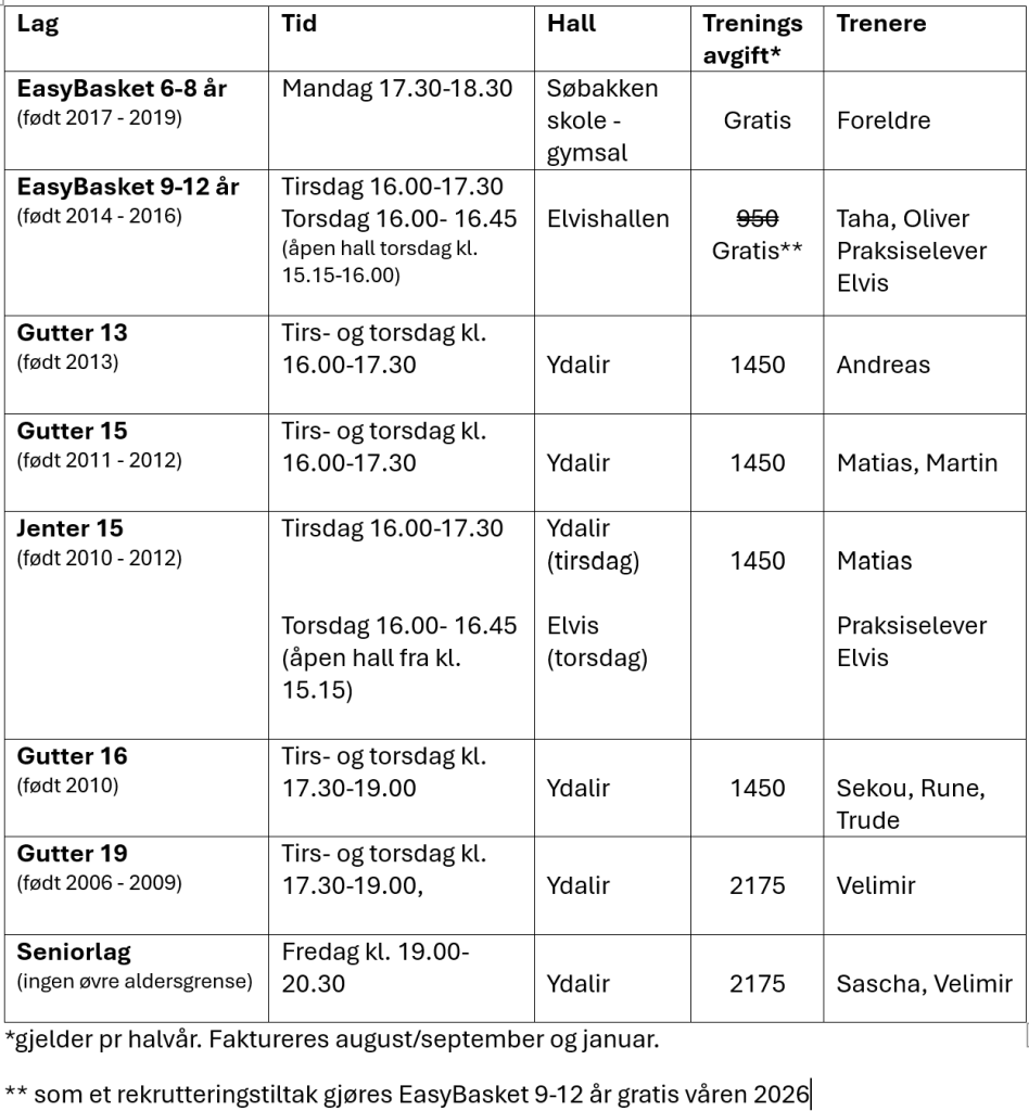 Treningstider 2025/2026 sesongen